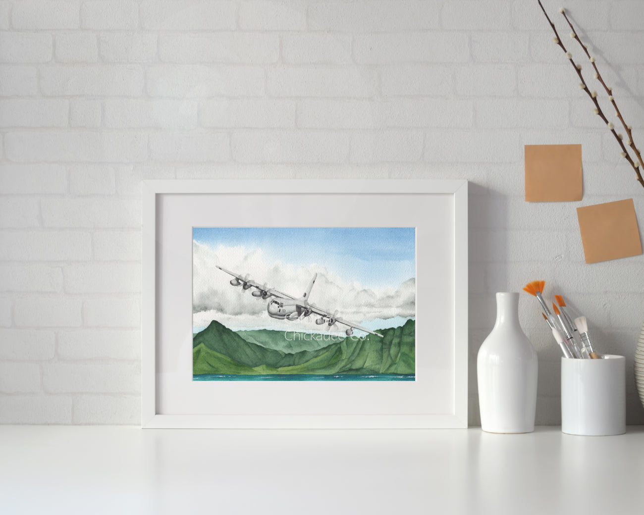 Bring the power and freedom of flight into your space with this KC-130J aircraft. Capturing the legendary cargo plane soaring above the ko'olau mountain range, this piece showcases the aircraft as seen from the Hale Koa beach, gliding beneath a vivid blue sky scattered with soft clouds.