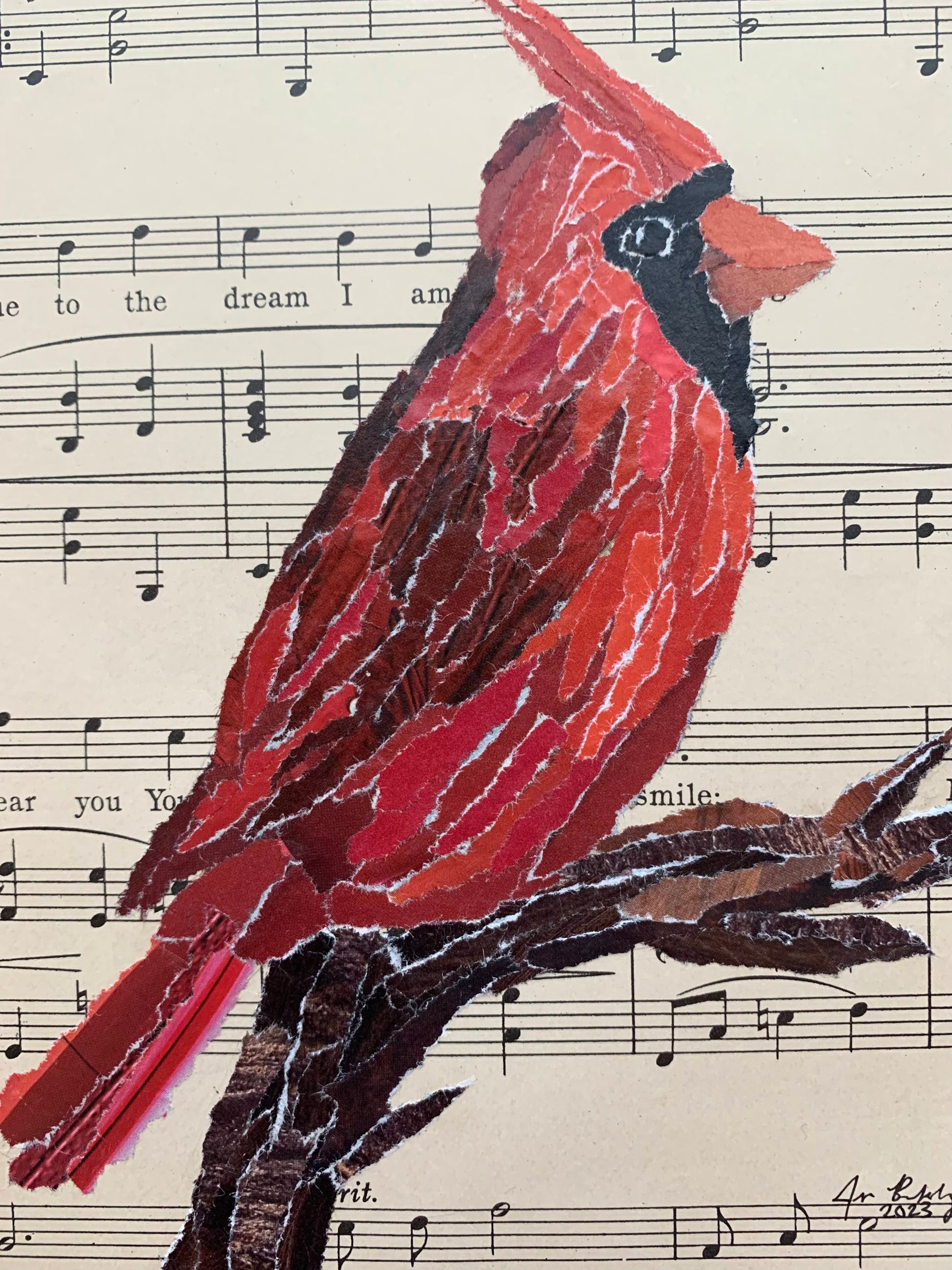 This handmade magazine paper collage of a northern cardinal is on vintage sheet music from the song "Someday I'll Find You." This collage will make the perfect addition to the wall above your piano, your living room, or any room that needs a little splash of red. These collages make perfect baby shower, wedding or house warming gifts for the music and bird lovers in your life.
